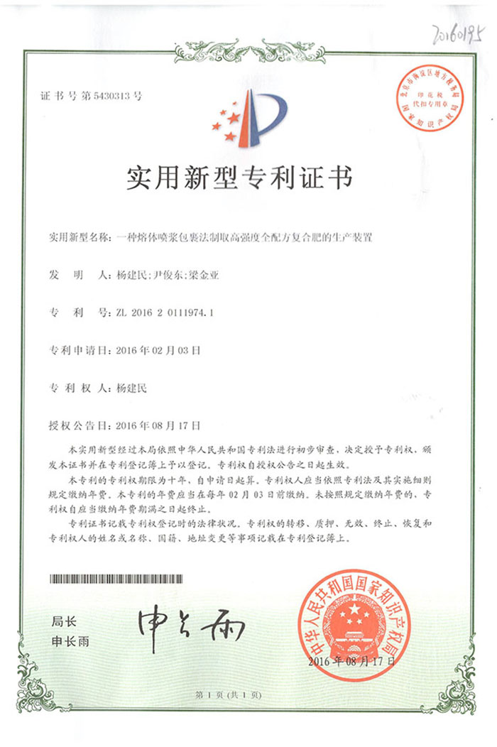 熱烈祝賀我公司又取得一項專利《一種熔體噴漿包裹法制取高強度全配方復(fù)合肥的生產(chǎn)裝置》