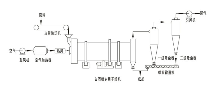 白酒糟烘干機(jī)主要由熱源、上料機(jī)、烘干滾筒、傳動裝置等構(gòu)成,濕酒糟送入烘干滾筒,筒體內(nèi)設(shè)有多個(gè)排列為螺旋形的抄板,通過簡體的旋轉(zhuǎn)帶動抄板將酒糟不停的揚(yáng)起,筒壁的擊打裝置防止物料粘結(jié)筒壁及抄板,揚(yáng)起的物料與由引風(fēng)系統(tǒng) 傳入的熱氣流充分接觸,加快了烘干傳熱、傳質(zhì),蒸發(fā)水分,完成干燥,由出料口排出。酒糟烘干機(jī)可快速將水分含量在 65%左右的濕酒糟經(jīng)過脫水、烘干至水分含量在10%左右的干品,用于制做高蛋白飼料,實(shí)現(xiàn)了酒糟烘干處理的機(jī)械化、工 業(yè)化、自動化。設(shè)備機(jī)械化程度高,生產(chǎn)能力大,可連續(xù)運(yùn)轉(zhuǎn),操作方便,故障少,維護(hù)費(fèi)用低,功耗低。